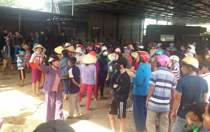 Người dân tập trung trong Nhà máy Chế biến thủy hải sản Nguyễn Hưng, cho rằng nhà máy này xả thải làm tôm chết hàng loạt. Ảnh: NC