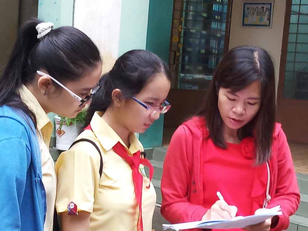 Cùng nhau ôn bài tại điểm thi THCS Trương Công Định. Ảnh: TRƯỜNG GIANG