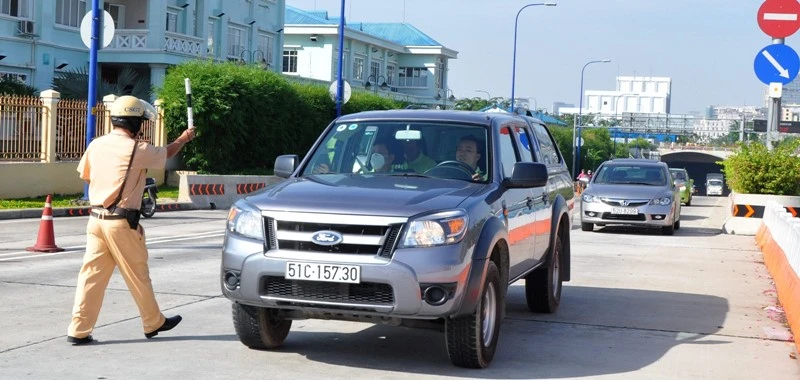 CSGT TP.HCM đang dừng xe xử lý một trường hợp vi phạm giao thông đã bị ghi hình trước đó. Ảnh: MP
