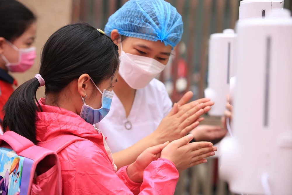 Các em được nhân viên y tế hướng dẫn khử trùng, sát khuẩn tay, thực hiện các biện pháp phòng chống dịch COVID-19. Ảnh: Phi Hùng