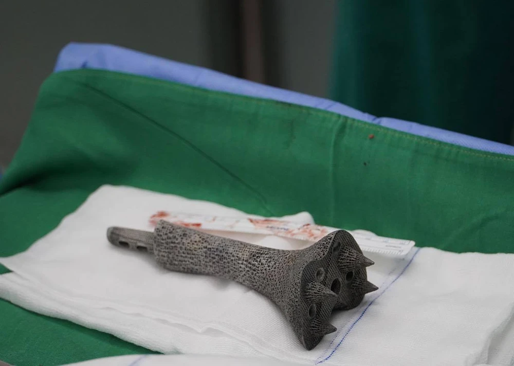 Chiều 5-1, các bác sĩ Khoa Chấn thương Chỉnh hình Bệnh viện (BV) Chợ Rẫy (TP.HCM) cho biết lần đầu tiên sử dụng mảnh ghép in 3D hợp kim titanium (titan) dạng tổ ong thay một đoạn xương chày cho bệnh nhân bị ung thư xương.