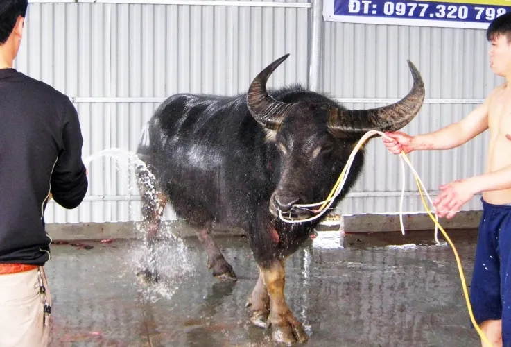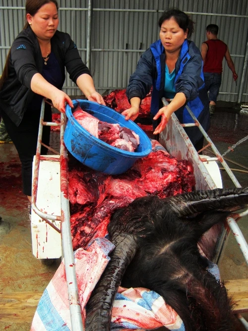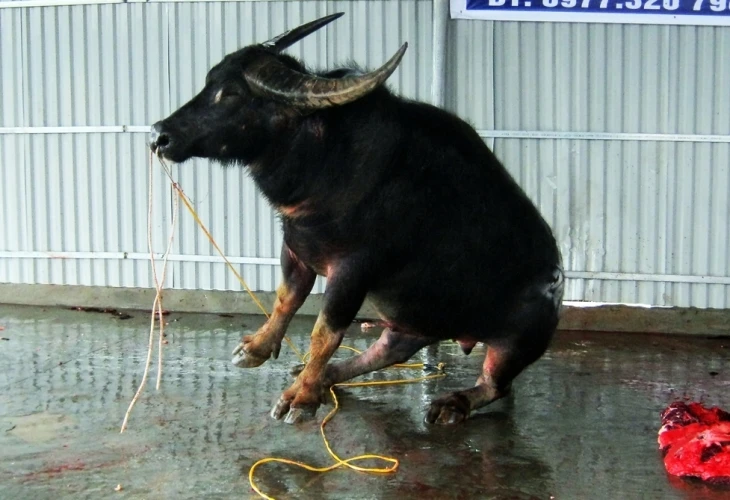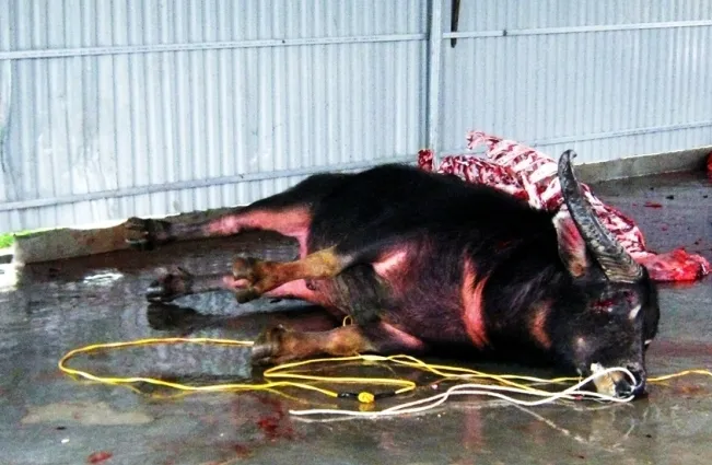 Trong ngày 14-3, 16 con trâu sau khi chọi thua đã bị xẻ thịt bán tại một khu giết mổ riêng. Trong ảnh là con trâu số 12, sau khi bị thua trong trận đấu đã được đưa đến bãi giết mổ riêng. Người ta dùng một vòng sắt vòng vào mũi trâu, sau đó đấu dây điện vào vòng sắt này. Trước khi đóng cầu giao để cho trâu bị giật, người ta cũng xịt nước để trâu sạch sẽ hơn.