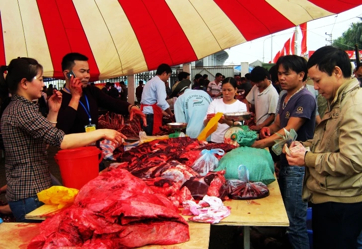 Sau khi con trâu đã xẻ thịt xong, người ta chuyển đầu trâu, thịt trâu lên chiếc xe cải tiến, rồi đưa ra khu bán thịt trâu chọi bên phía ngoài sân vận động.