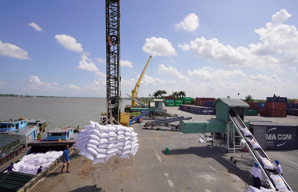 Vận chuyển gạo vào container để xuất khẩu sang châu Âu.