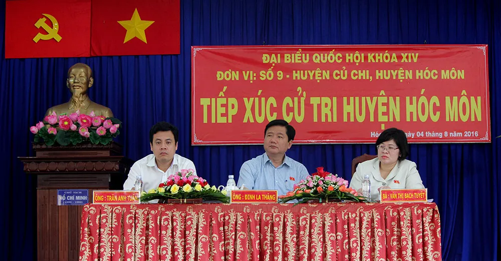 ĐBQH khóa XIV, đơn vị bầu cử số 9 - huyện Hóc Môn, huyện Củ Chi có ông Trần Anh Tuấn, ông Đinh La Thăng, bà Văn Thị Bạch Tuyết (từ trái sang) tiếp xúc cử tri huyện Hóc Môn, sáng 4-8. Ảnh: HOÀNG GIANG