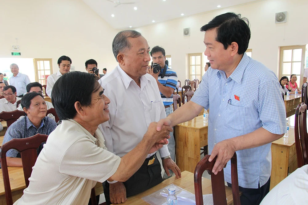 ĐBQH - Bí thư Thành ủy TP.HCM Đinh La Thăng thăm hỏi bà con cử tri trong buổi tiếp xúc cử tri huyện Hóc Môn, sáng 4-8. Ảnh: HOÀNG GIANG