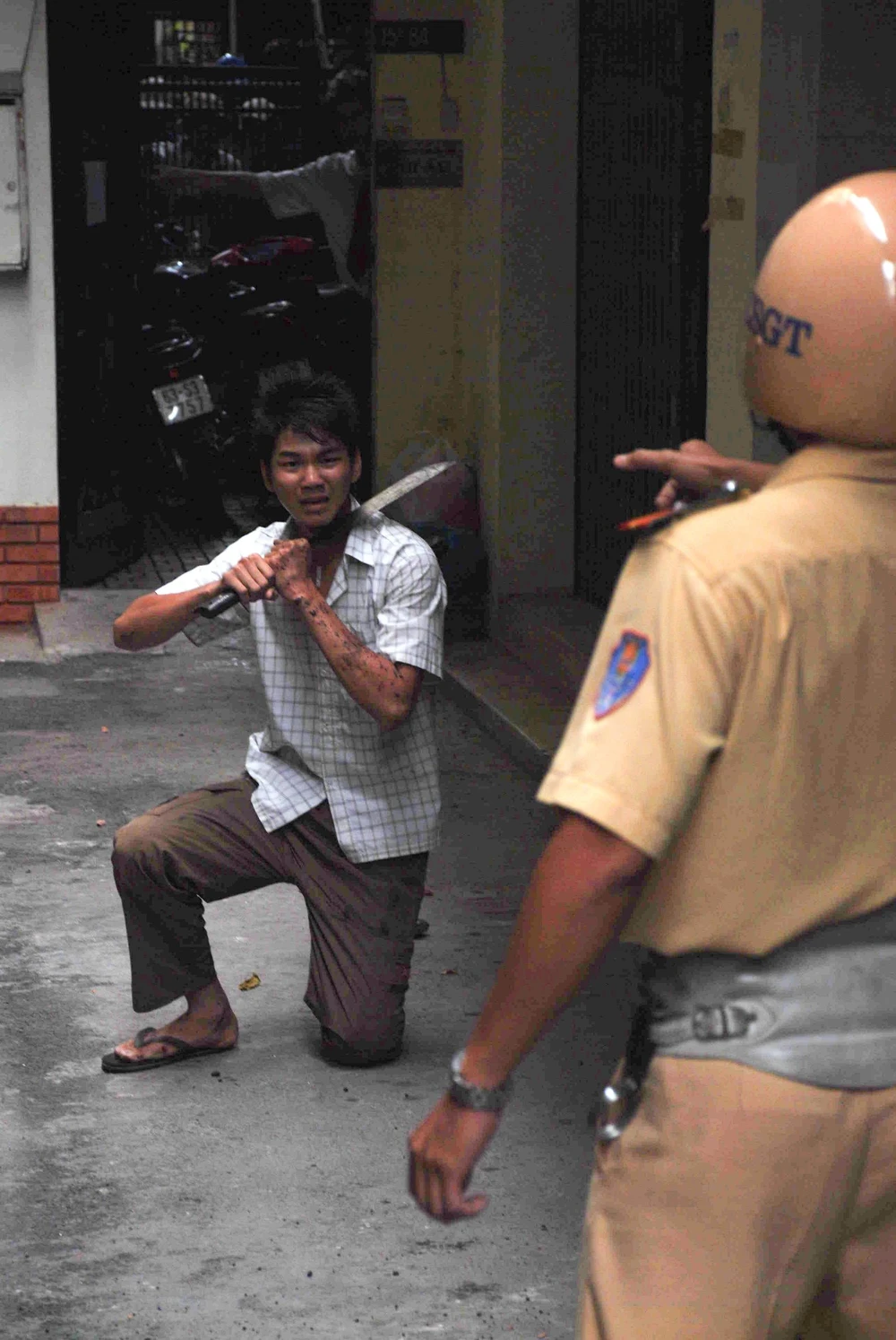Đại úy Nguyễn Đăng Thanh (lúc đó đang là thiếu úy) một mình thuyết phục tên cướp buông bỏ mã tấu, đầu hàng cách đây 11 năm, tại quận 1, TP.HCM. Ảnh: Dave MacMillan