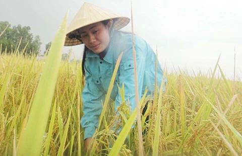 Em Hằng đang gặt lúa. Ảnh: T.ANH