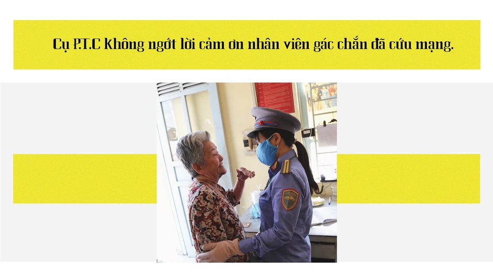 "Rồi vèo cái, cô nhân viên gác chắn bỏ cờ hiệu lao tới bà cụ, rồi thêm một cô nữa, cả hai ôm bà cụ ngã xèo sang một bên, cả ba nằm đó. Đoàn tàu chạy qua. Chân mỗi người cách đường ray chút xíu. Hú hồn. Cụ bà thoát chết trong gang tấc. Tôi nhìn vội vào điện thoại, đúng 8 giờ 17 phút", ông Nguyễn Văn Châu kể.