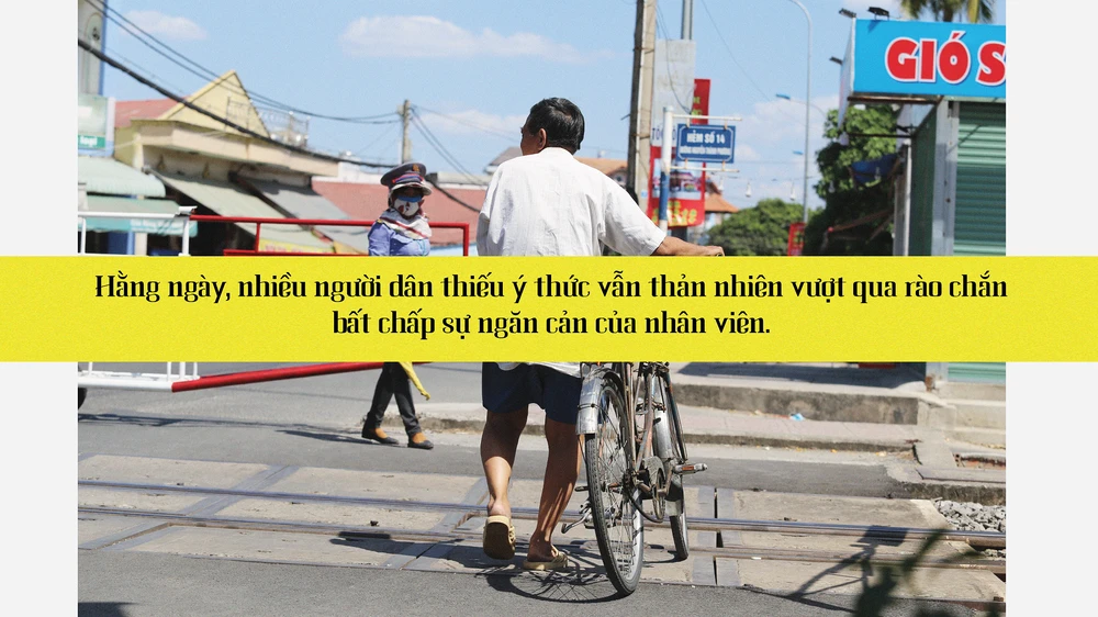 “Ở trạm này, không được để người dân chờ quá ba phút, thời gian dừng lại chờ tàu qua chỉ tầm hơn 2 phút thôi. Nhưng vẫn có nhiều người không chờ được. Họ tìm mọi cách vượt qua, người nhảy qua gác chắn, người thì leo trèo qua. Có người khi chúng tôi nhắc nhở họ còn quay lại quát mắng: “Tàu đã tới đâu mà kéo”, thậm chí là chửi thề: “Mày không thấy bố mày qua sao mà kéo, tránh đường cho bố mày đi”…”, chị Minh cười buồn.