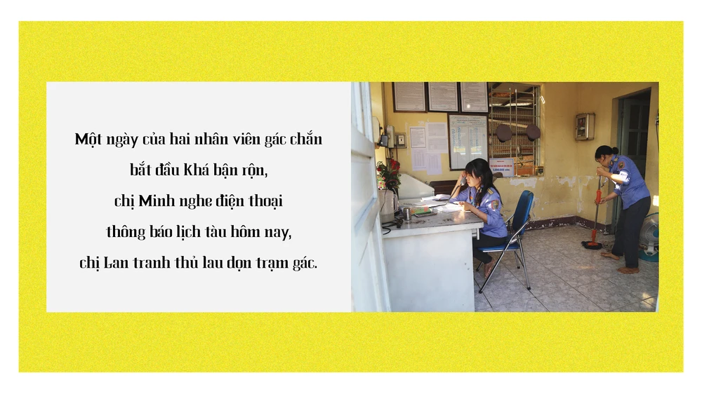 6 giờ sáng, chị Minh và chị Lan đã có mặt tại trạm với trang phục gọn gàng quen thuộc. Một lát, điện thoại reo, báo chuyến tàu đầu tiên của ngày sắp đi qua. 6 giờ 20 phút, chẳng cần ai bảo ai, mỗi người một việc. Đèn tín hiệu chớp đỏ liên tục yêu cầu người đi đường dừng lại. Hai chị thoăn thoắt đẩy thanh chắn barie, khóa chắn, phất cờ báo hiệu… Hơn 2 phút sau, khi đoàn tàu đã đi qua, thanh chắn lại được kéo về vị trí cũ để người đi đường lưu thông dễ dàng.