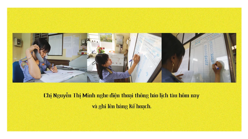 Lấy tay áo lau vột giọt mồ hôi trên trán, chị Minh kể chuyện mỗi ca trực của các chị kèo dài 12 tiếng, từ 6 giờ sáng đến 18 giờ chiều, và từ 18 giờ đến 6 giờ sáng hôm sau. “Ngày Tết, lượng tàu ra vào đông hơn, như đêm hôm qua đến 23 chuyến. Ngày cao điểm phải đến 27-28 chuyến. Ngày bình thường thì 16-17 chuyến”, chị Minh chia sẻ.