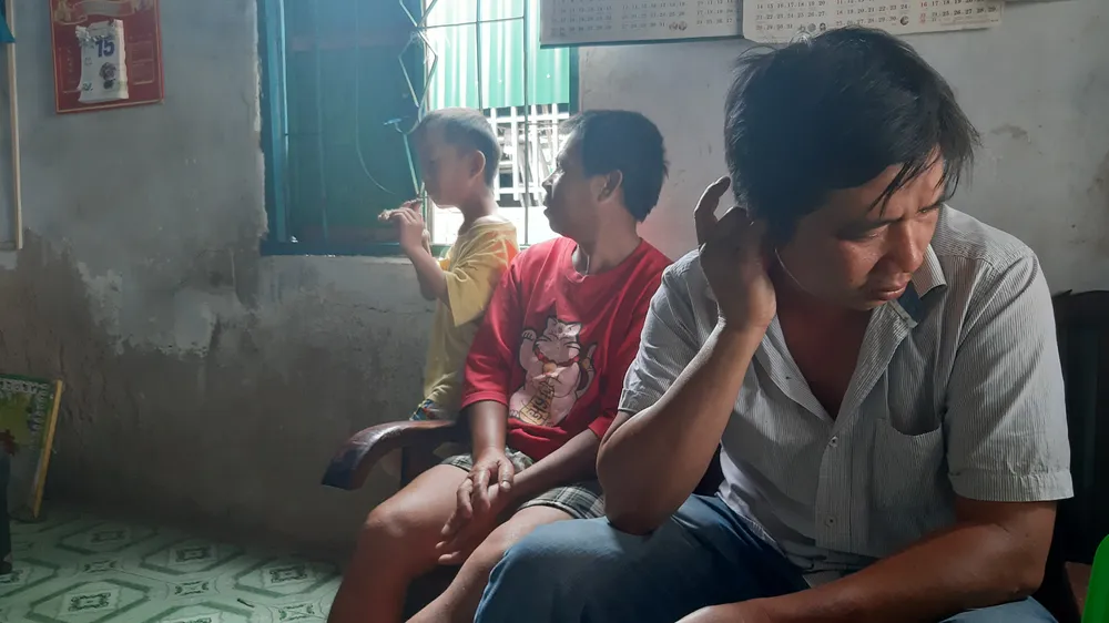 Vừa dứt lời, anh Phiên- cha của bé Phi Long từ đâu chạy xe về, nói anh đi Phan Rí làm bốc vác mấy ngày nay giờ mới xong.