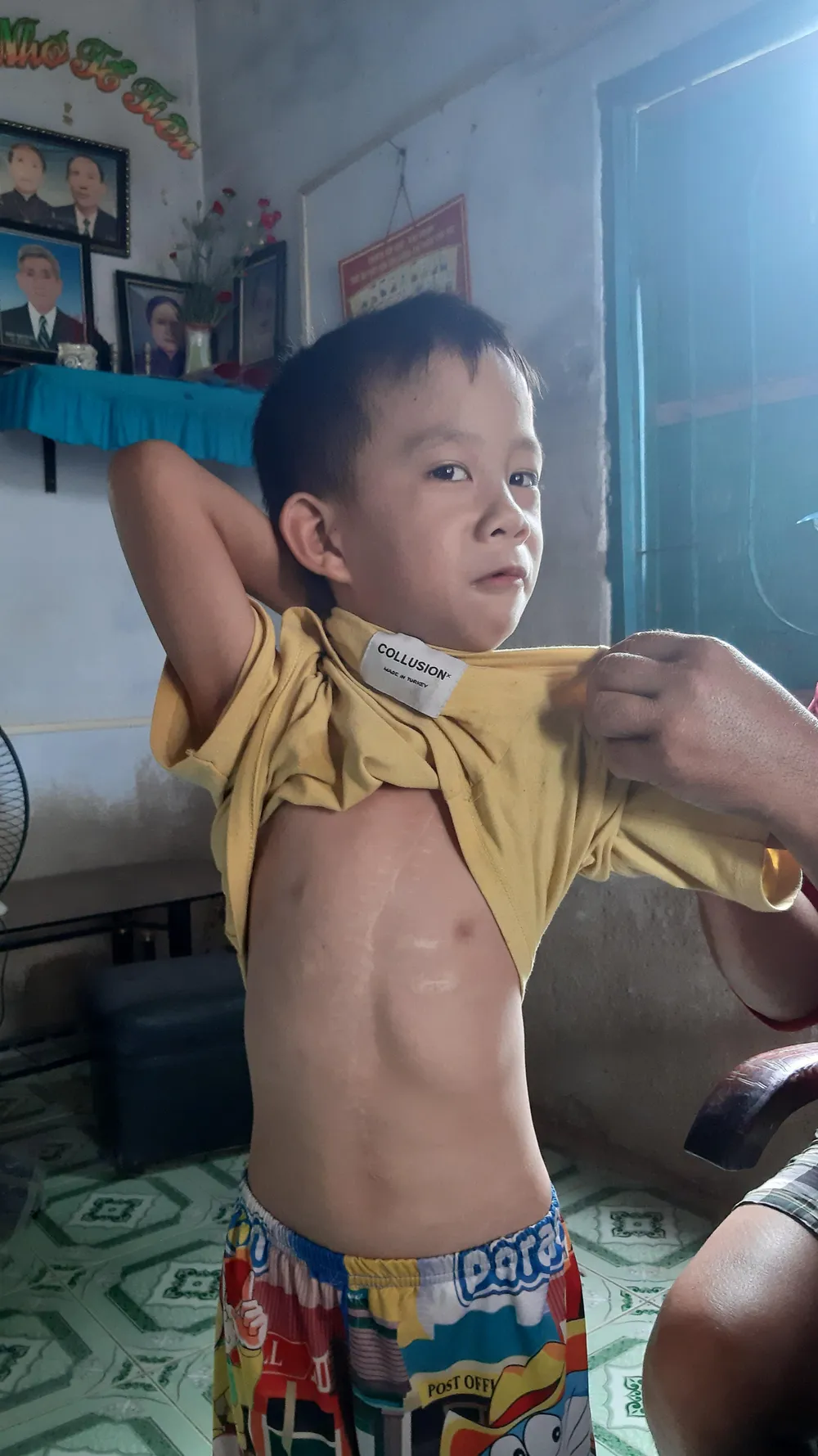 Chúng tôi hỏi Phi Long vết mổ con đâu, cu cậu kéo áo chỉ vào vết mổ chạy dài từ ngực xuống bụng mình và nhe chiếc răng sún ra cười khúc khích.