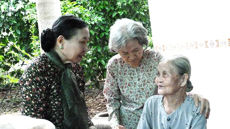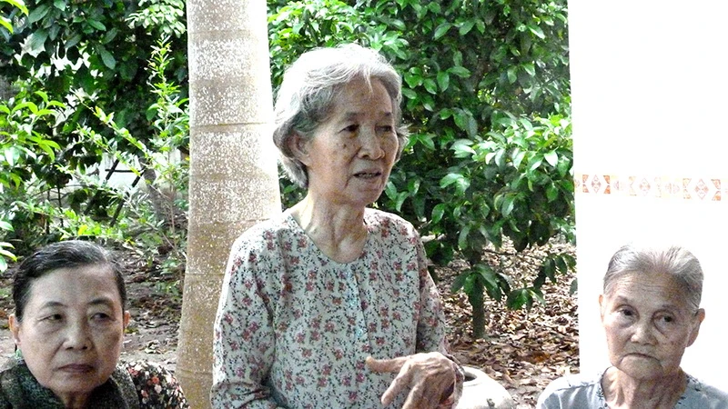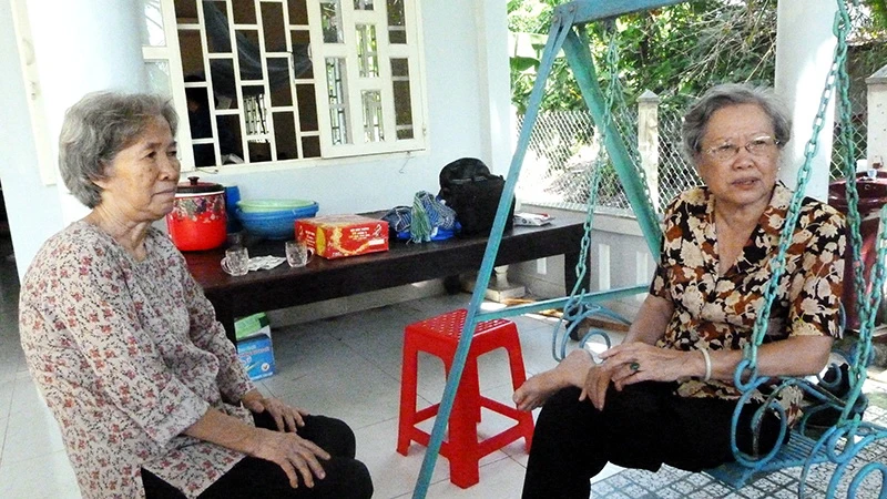 Cô Chín Mai (bìa trái) và cô Xuân Hồng (bìa phải) cùng nhau ôn lại ngày sát cánh bên nhau. Ảnh: LÊ THOA