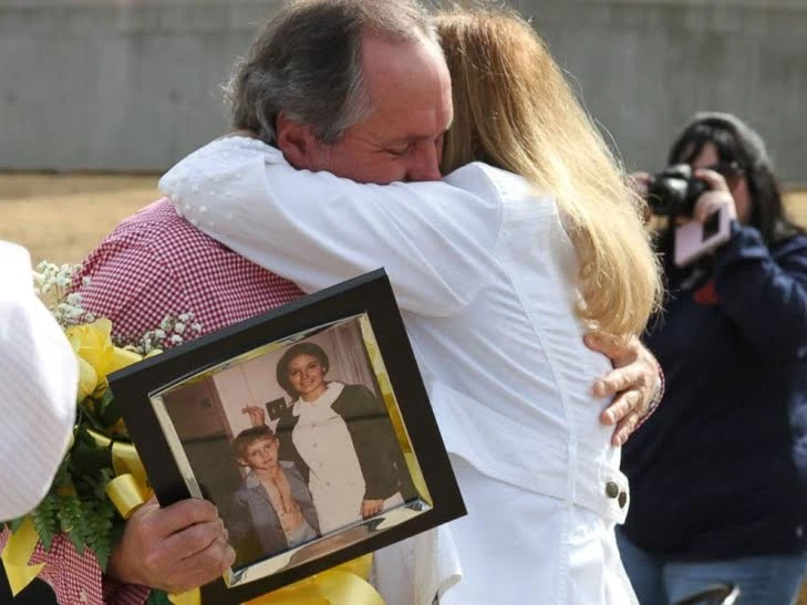 Bentley trong phút giây xúc động gặp lại nữ y tá sau 42 năm tìm kiếm. Trên tay ông là tấm hình 2 người chụp chung khi ông 10 tuổi.