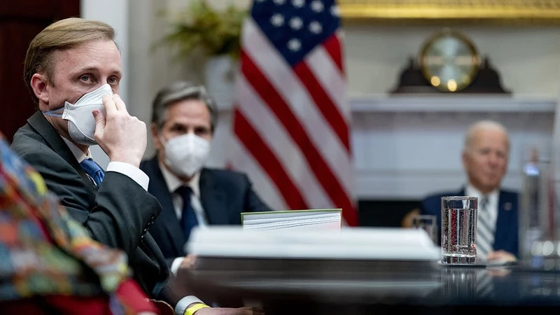 Từ trái qua: Cố vấn an ninh quốc gia Mỹ Jake Sullivan, Ngoại trưởng Mỹ Antony Blinken và Tổng thống Mỹ Joe Biden trong một phiên họp ở Nhà Trắng hồi tháng 2. Ảnh: REUTERS