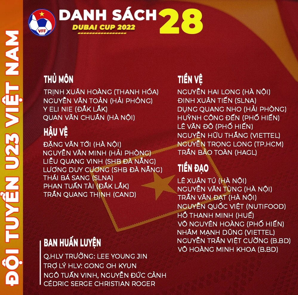 Đội tuyển U-23 Việt Nam sẽ tham dự giải U23 quốc tế – Dubai Cup 2022 với tổng cộng 28 cầu thủ. Các cầu thủ không có tên trong danh sách gồm hậu vệ Đoàn Anh Việt, Lê Văn Xuân, Nguyễn Thanh Bình, tiền vệ Lý Công Hoàng Anh và tiền đạo Mai Xuân Quyết.