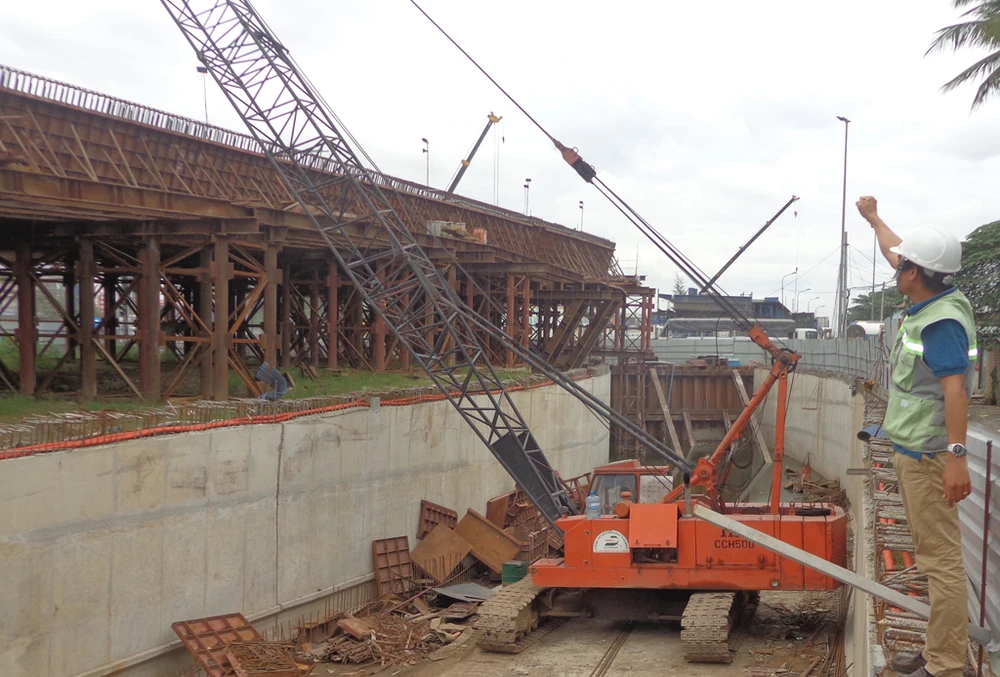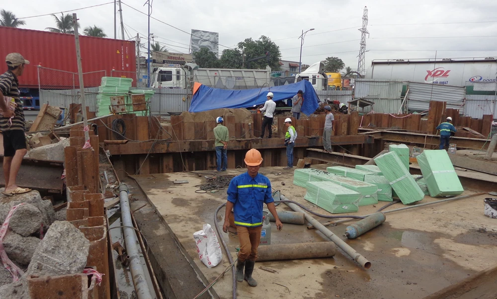 Ở hướng từ đường cao tốc TP.HCM - Long Thành đổ vào nút giao Mỹ Thủy, các hạng mục cầu vượt và hầm hở để đi xuống hầm chui kín đang được gấp rút thi công.