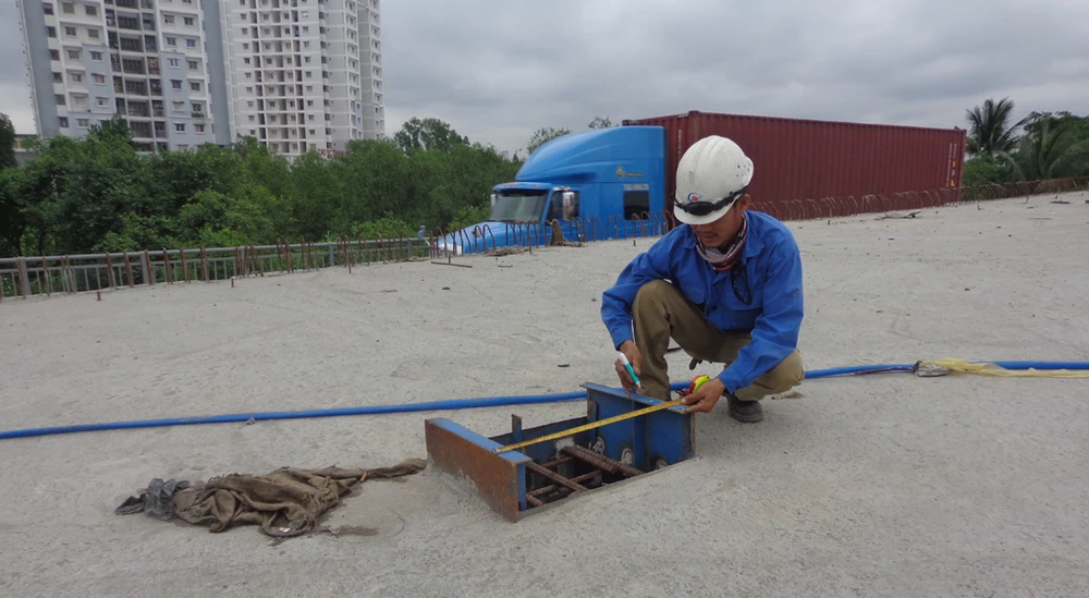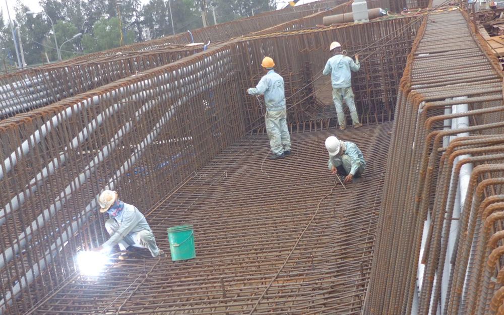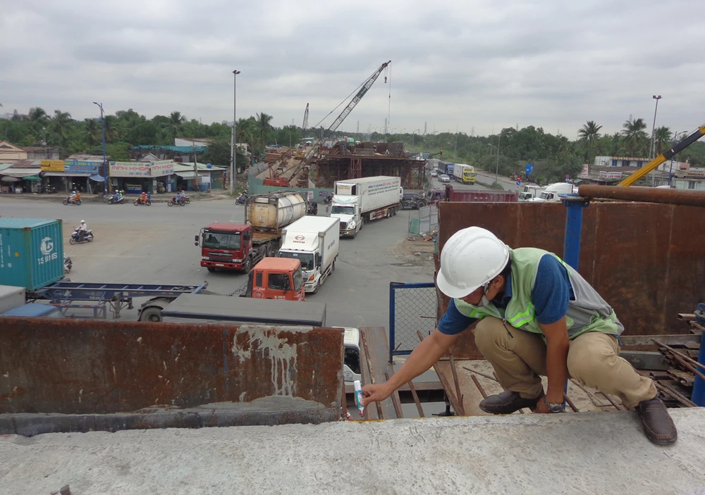Các nhịp cầu vượt ở hai đầu đang dần hình thành và chờ nối vào các trụ, nhịp ở giữa. Theo ông Lê Ngọc Hùng, sau khi đúc xong hai đốt hầm kín còn lại sẽ tiến hành đúc các trụ ở giữa nút giao để đúc tiếp các dầm cầu vượt nối hai bên cầu vượt lại.