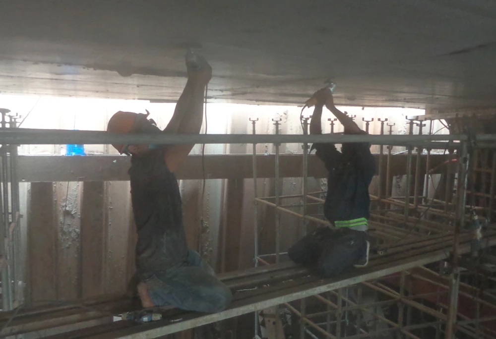 Trong lòng đốt hầm kín âm dưới đất, công nhân tút lại bản nóc bê tông cho trơn nhẵn...