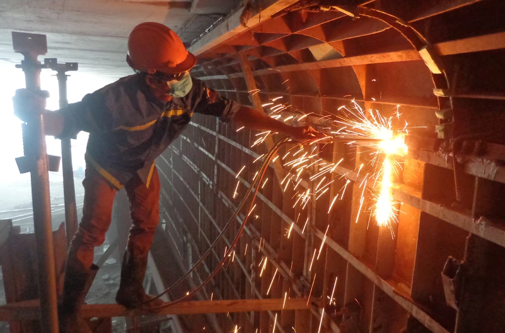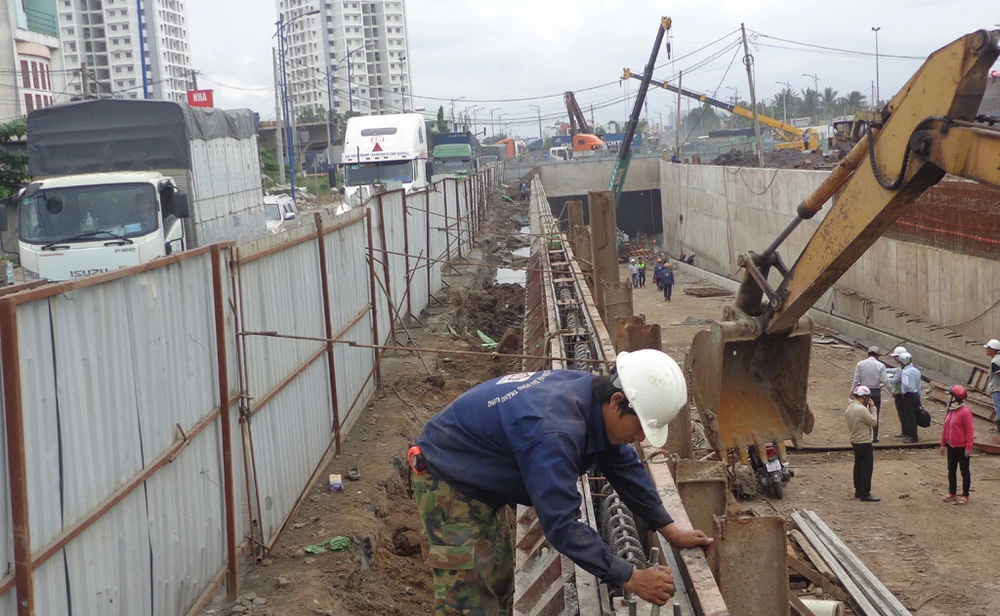 Hầm kín, hầm hở và đường xe chạy hai bên đã định hình. Trong ảnh: Công nhân lắp ván khuôn để đúc vách ngăn giữa hầm hở và phần đường xe chạy bên trên.