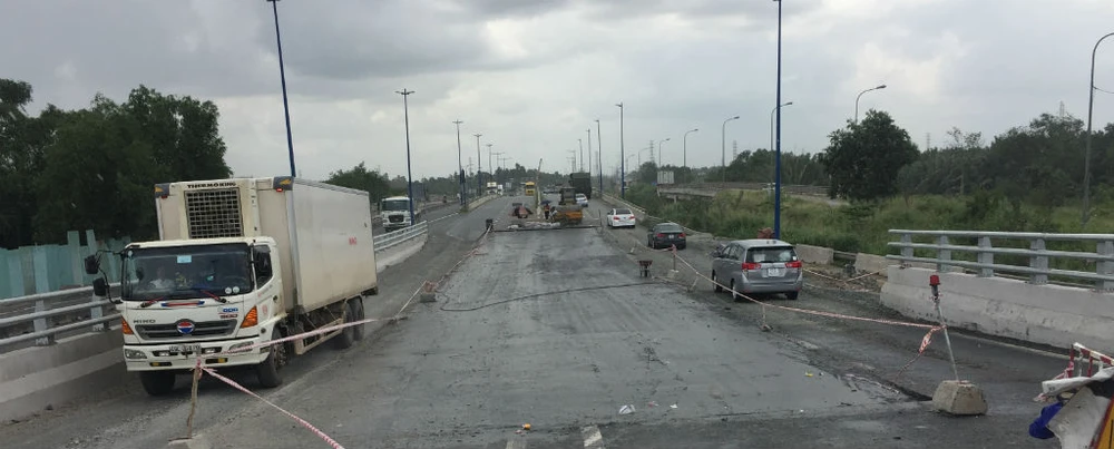 Hiện các loại xe được đi tạm ở hai biên của đoạn đường dẫn với tốc độ chậm. Đây là giải pháp để giảm áp lực xe phải đi dưới cầu vượt qua vòng xoay nút giao Mỹ Thủy ở trên mặt đất.