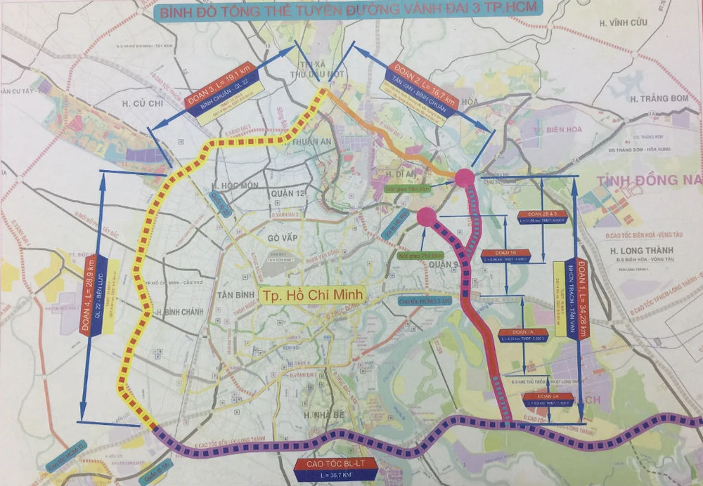 Theo bình đồ trên, đoạn Vành đai 3 qua TP.HCM nối Bình Dương - TP.HCM - Long An có màu vạch nền vàng, nét đứt màu đỏ được ưu tiên đầu tư