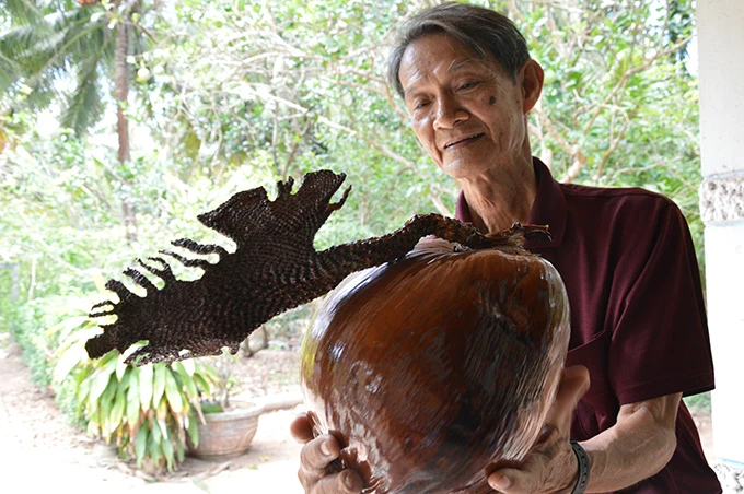 Sau khi ươm giống, ông Thưởng giữ lại quả dừa “điềm báo lành” để làm kỷ niệm - Ảnh: Thúy Hằng