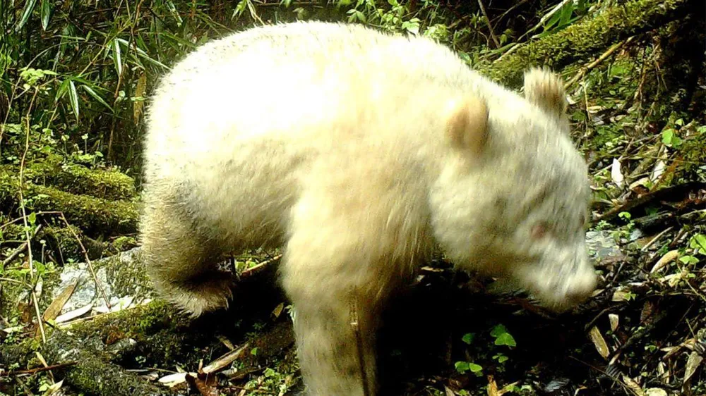 Chú gấu trúc bạch tạng khổng lồ hiếm thấy trong rừng trúc ở tỉnh Tứ Xuyên, Trung Quốc. Ảnh: CNN