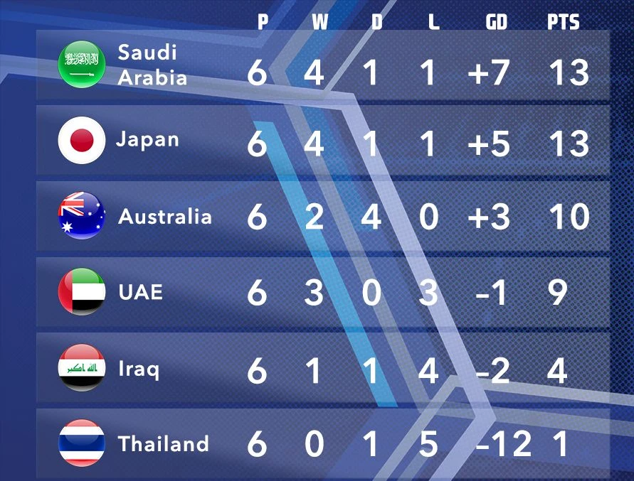 Tại bảng B, Thái Lan coi như hết cơ hội khi đêm qua họ thua thảm Saudi Arabia đến 0-3. Ngoài ra ở lượt trận tiếp theo, Thái Lan phải đến Nhật Bản làm khách. Một thất bại trước người Nhật là kết quả có thể dự báo trước với Thái Lan.