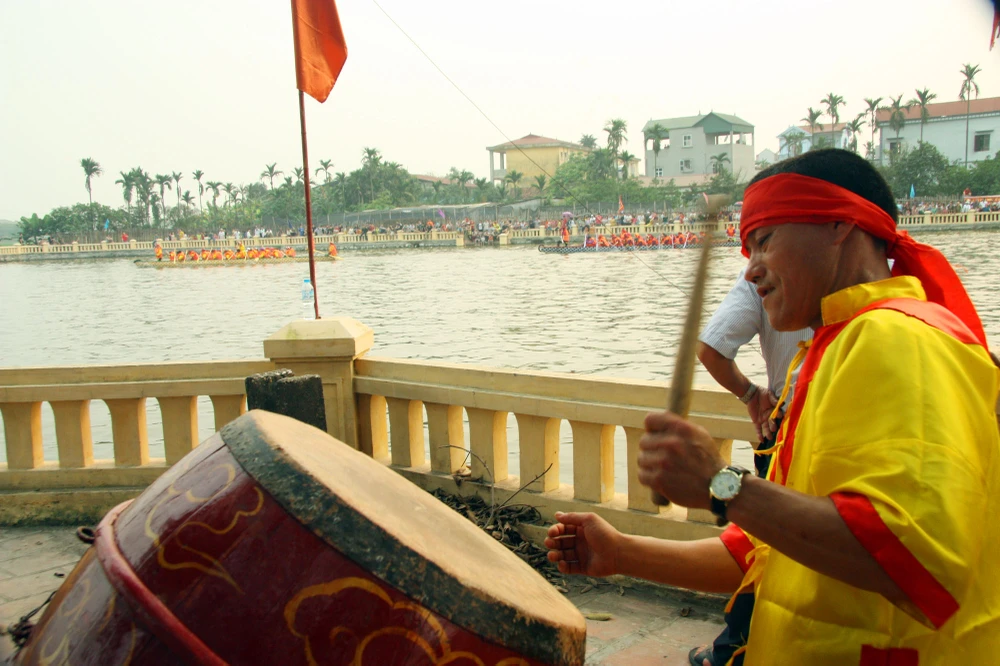 Dưới thuyền người "nhạc trưởng" cũng liên tục khua chiêng, thổi còi theo nhịp bắt nhịp cho đoàn thủy binh của mình.