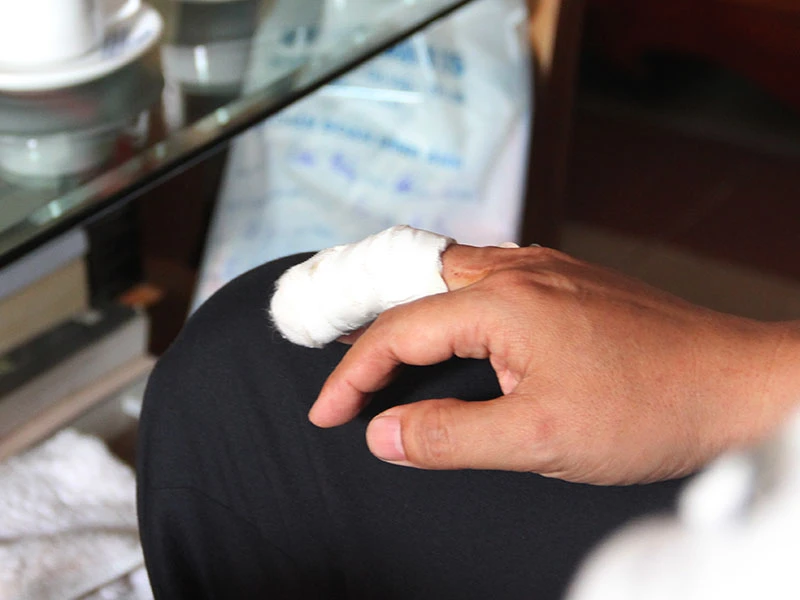 “Tôi hốt hoảng ôm đầu bỏ chạy vào trong, phía sau nhóm người này lao đến. Sau vài chục bước tôi đưa tay xuống xem thì thấy máu chảy tràn từ tay và đầu. Ngón tay bị đánh gần như dập nát, phía cánh tay cũng bị vết thương dài, máu phun xối xả” - ông Đông kể.