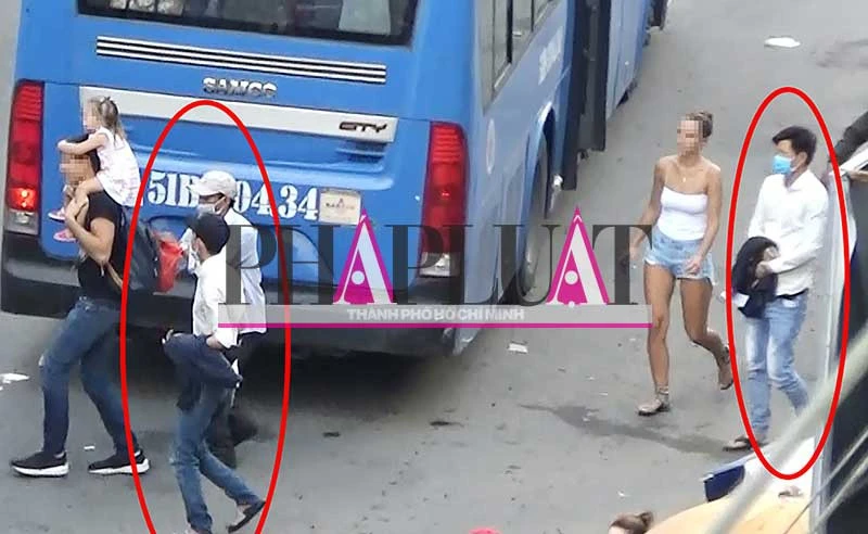 Nhóm móc túi đang lấy điện thoại của du khách người nước ngoài. Ảnh: TÂN-YÊN.