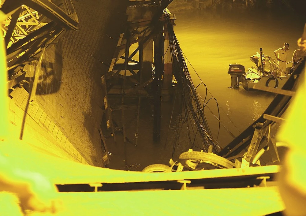 Một nhịp cầu đã bị sập hoàn toàn xuống sông sau sự cố. Ảnh: H.TÂM