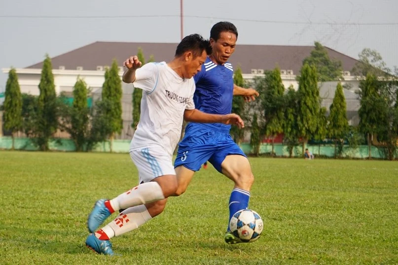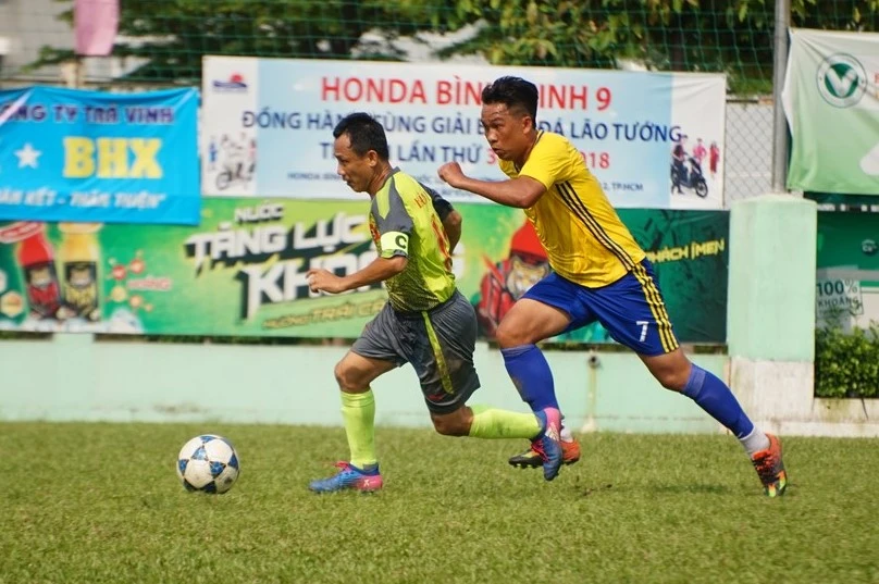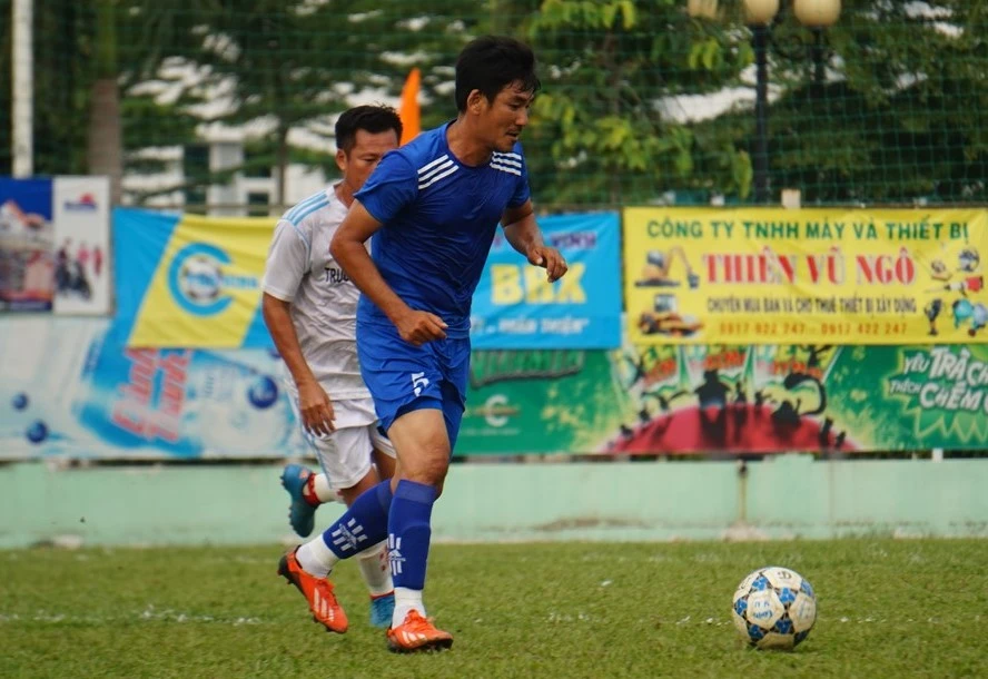 Đội trưởng Anh Tuấn (lão tướng Hàn Thuyên, quận Phú Nhuận) thoát khỏi sự kiểm soát của hậu vệ lão tướng Nhơn Trạch (Đồng Nai).