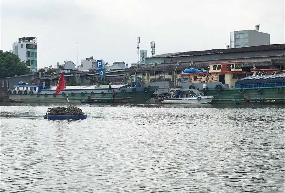 Đến 17 giờ ngày 15-5, lực lượng chức năng TP.HCM vẫn đang phong tỏa hiện trường, điều tiết giao thông thủy, xử lý hiện trường chiếc ghe bị chìm trên dòng kênh Tẻ, đoạn qua phường Tân Kiểng, quận 7, TPHCM.