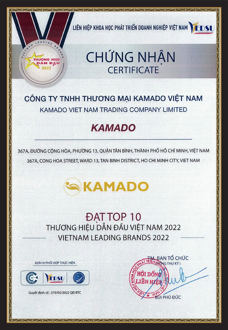 Tuy chỉ mới gia nhập thị trường ghế massage được 2 năm nhưng Kamado khẳng định được chất lượng qua giải thưởng chứng nhận thương hiệu thuộc top 10 thương hiệu dẫn đầu Việt Nam do Viện Nghiên c Kinh tế Châu Á, Viện khảo sát đánh giá chỉ số cạnh tranh và Liên hiệp Khoa học Phát triển Doanh nghiệp Việt Nam trao tặng.