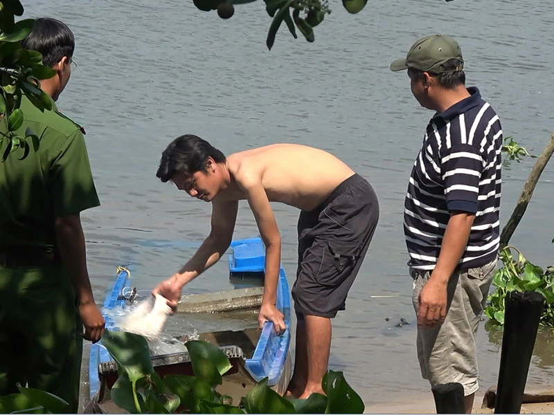 May mắn sự cố không khiến 2 người trên ghe bị thương. Sau đó, người dân đã vớt ghe và tiếp tục kéo thi thể đến đoạn bờ sông thuận lợi đưa thi thể này lên xe của lực lượng chức năng.