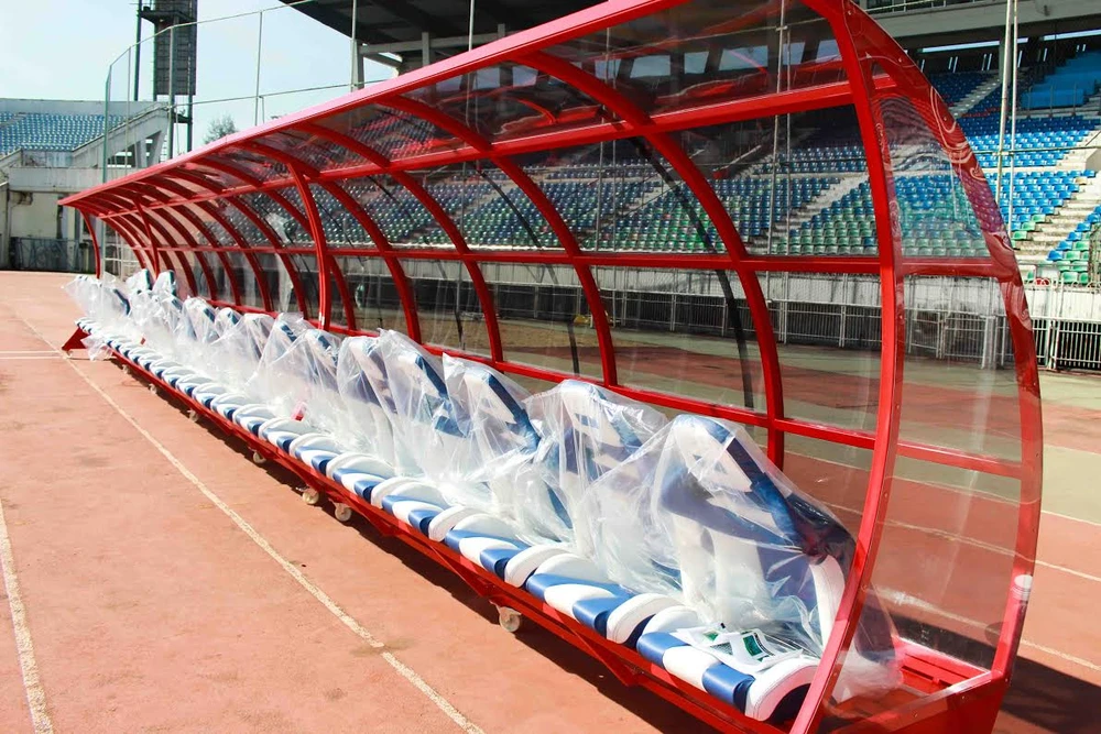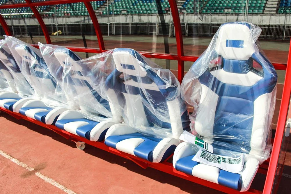 Khi chúng tôi đến thì những chiếc xe tải đang “nhả hàng” những chiếc ghế đệm mút sang trọng như những ghế ngồi khu vực kỹ thuật của các giải Ngoại hạng Anh, Đức…
