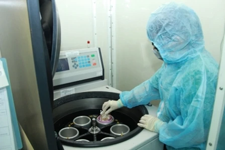 Kỹ thuật viên đang tách triết lấy tế bào gốc từ cuống rốn.