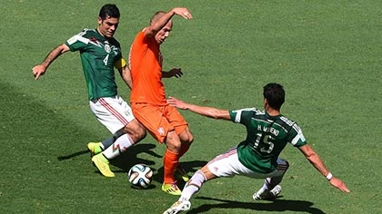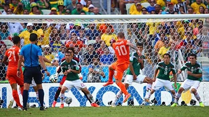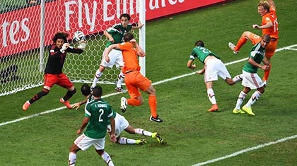 Phút 58, Robben đá phạt góc rất đẹp cho De Vrij băng vào đánh đầu ở cự ly gần cực mạnh nhưng thủ thành Ochoa có pha phản xạ xuất thần đẩy bóng bật mép trong xà ngang bật ra. Tình huống này, ngoài sự xuất sắc, Ochoa cũng có chút may mắn khi cú đánh đầu rất mạnh từ khoảng cách chỉ 3 mét trước khung thành của De Vrij lại đi đúng vị trí Ochoa chọn sẵn.