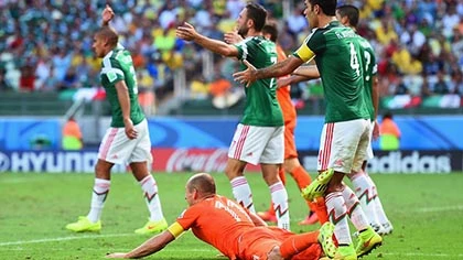 Phút 68, lần thứ 2, Robben có pha đi bóng bên cánh phải sộc thẳng vào vòng cấm Mexico và… ngã đẹp nhưng trọng tài vẫn không thổi phạt đền. Lần này trọng tài đã đúng khi Robben có pha bóng ma mãnh tự cài chân mình vào chân hậu vệ đối phương rồi ngã lăn ra sân. Nếu nghiêm khắc hơn, trọng tài hoàn toàn có thể rút thẻ vàng cảnh cáo Robben.