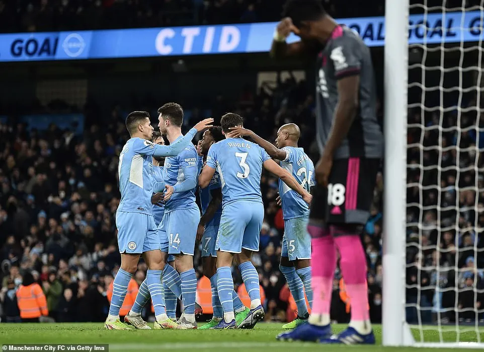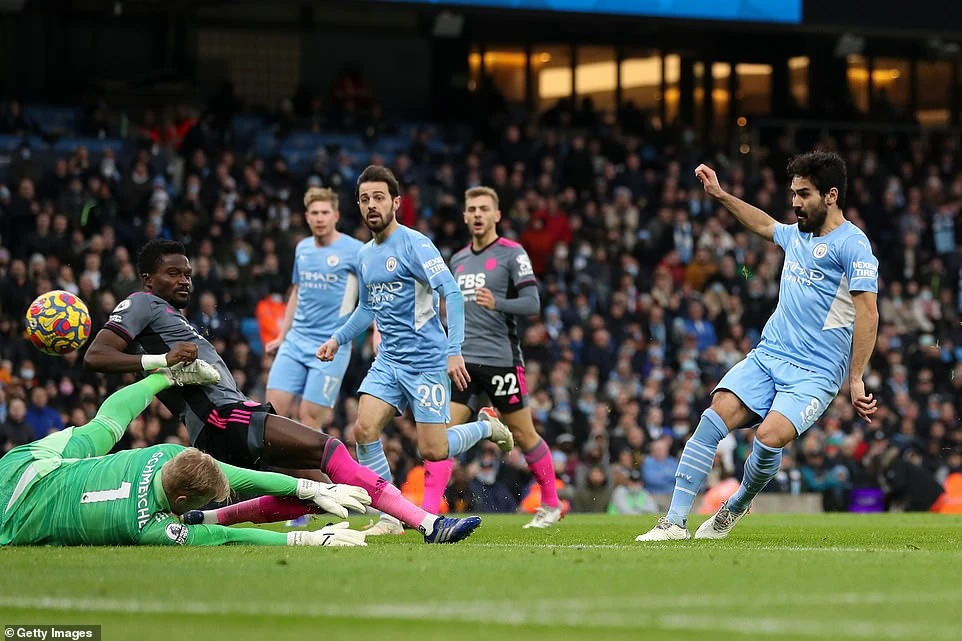 Đến phút 21, một pha phối hợp đẹp như tranh vẽ của Man City cùng sai lầm đẩy bóng vào chân đối phương của Kasper Schmeichel đã giúp Gundogan thoải mái sút bóng vào lưới trống ghi bàn nâng tì số lên 3-0 cho đội chủ sân Etihad.