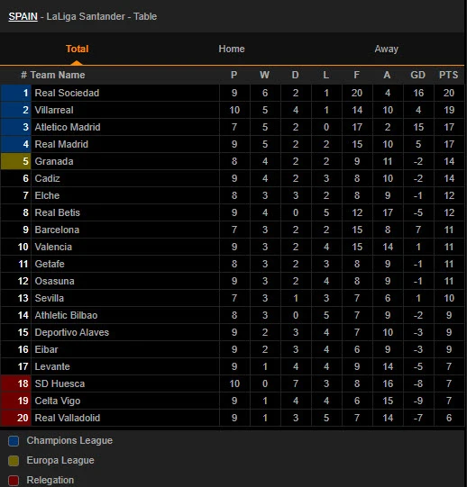 Hòa 1-1, Real Madrid vẫn giữ vị trí thứ 4 trên bảng xếp hạng La Liga với 17 điểm (đá 9 trận). Trong khi đó, Villarreal giữ được vị trí thứ hai với 19 điểm sau 10 trận. Hiện Real Sociedad đang bất ngờ dẫn đầu La Liga với 20 điểm sau 9 trận.