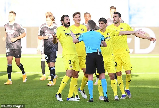 Cầu thủ Villarreal vây lấy trọng tài phản đối nhưng không thành. ẢNH: GETTY IMAGES