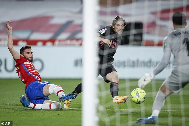 Modric sút chéo góc giúp Real Madrid có bàn thắng mở điểm. Ảnh: AP.