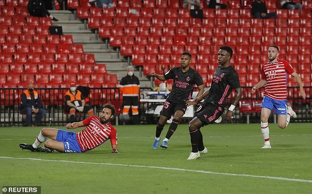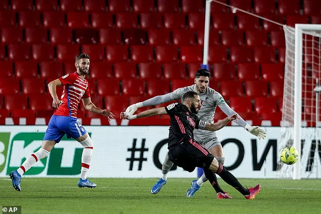 Trong hiệp một, Real Madrid thi đấu vượt trội hơn khi có được tỷ lệ kiểm soát bóng lên đến 62%. Phút 14, thầy trò Zidane có tình huống nguy hiểm khi Benzema đánh đầu cận thành sau pha treo bóng vào cấm của Rodrygo. Tuy nhiên pha đánh đầu của tiền đạo người Pháp không thể đánh bại được thủ môn Rui Silva của chủ nhà Granada.