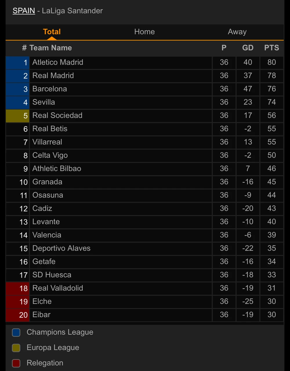 Đánh bại chủ nhà Granada với tỷ số 4-1, Real Madrid có được vị trí thứ hai với 78 điểm sau 36 vòng đấu, kém đội đầu bảng Atletico Madrid 2 điểm. Ở cùng vòng đấu, Atletico Madrid có chiến thắng với tỷ số 2-1 trước Real Sociedad.