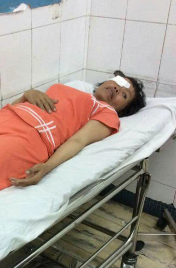 Cô Trương Thị Xí, bị tai nạn phải mổ mắt bỏ dở việc bán nón bảo hiểm phụ chồng